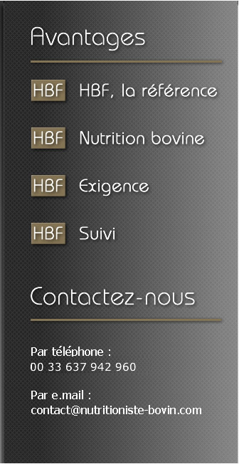 HBF nutrition c est une équipe de trois nutritionnistes bovins à votre écoute, nous avons fait de notre passion notre métier, la nutrition des bovins . Vous pourrez trouver de nombreuses références en France et à l'étranger, aussi bien en production laitière qu'en viande.